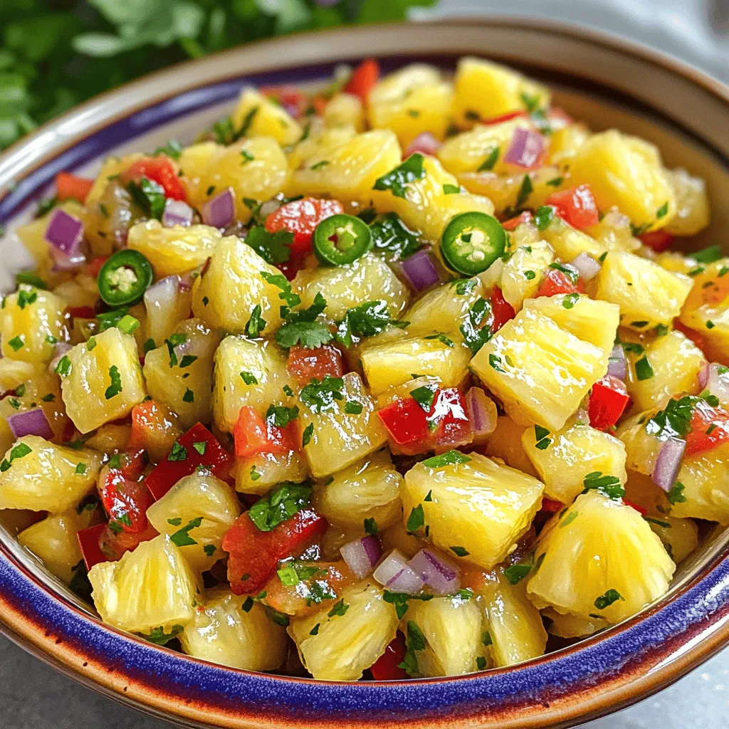 Die Zutaten für die Spicy Pineapple Salsa sind frisch und einfach. Die Ananas bringt Süße und Saftigkeit. Die rote Paprika fügt einen knackigen Biss hinzu. Die Zwiebel gibt den Salsa einen tollen Geschmack. Der Jalapeño sorgt für Schärfe. Du kannst die Menge anpassen, um die Schärfe nach deinem Geschmack zu wählen. Der Koriander bringt einen frischen, grünen Geschmack. Der Limettensaft fügt Säure hinzu, die die Süße der Ananas ausgleicht. Honig ist optional, aber er kann die Salsa süßer machen.