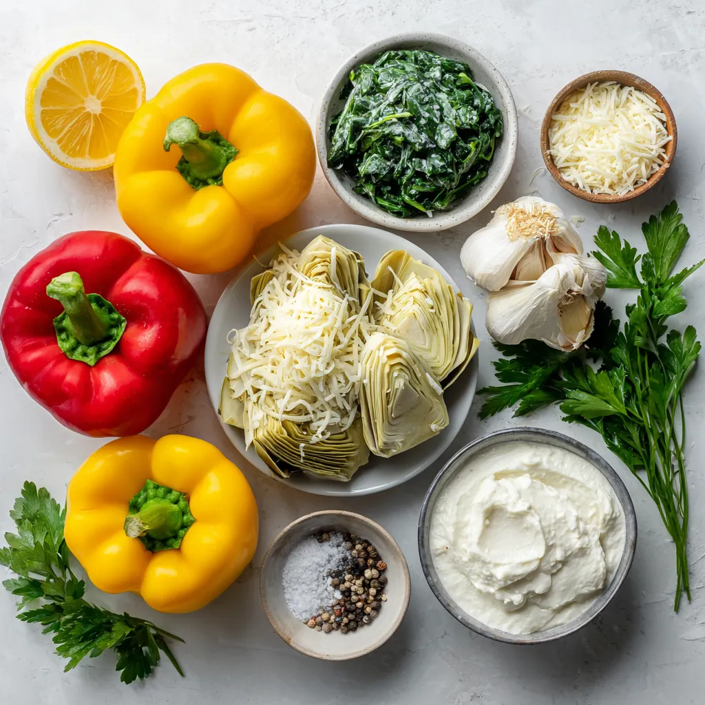 Hauptzutaten für Spinatr-Artischocken gefüllte Paprika