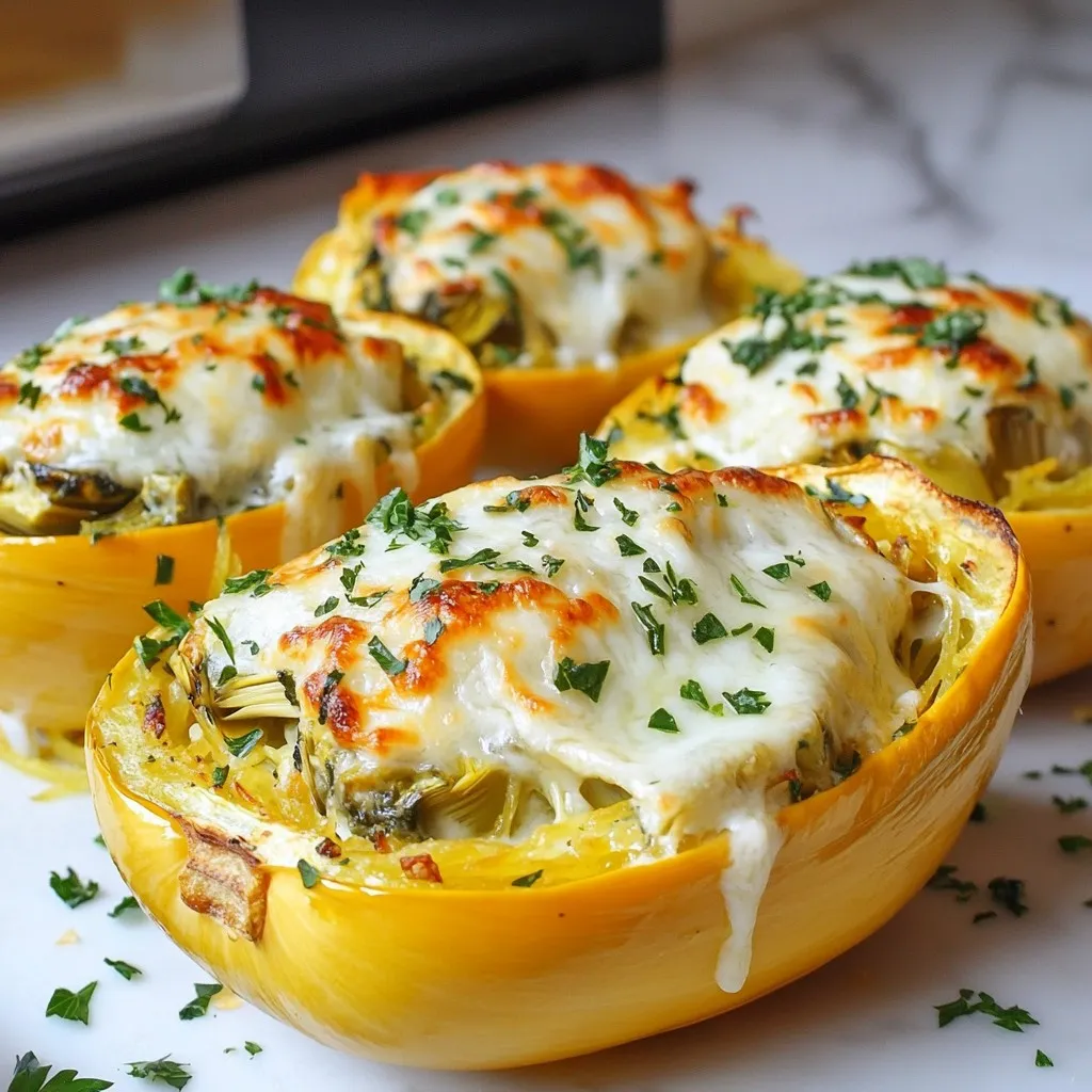 Ein köstliches und gesundes Gericht mit Spaghetti-Kürbis, gefüllt mit einer cremigen Mischung aus Spinat und Artischocken.