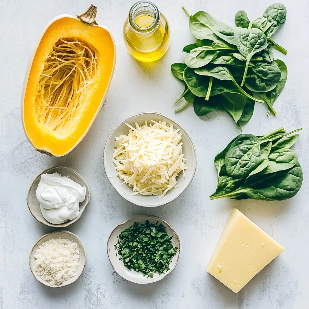 Hauptzutaten für Spinat-Artischocken gefüllten Spaghetti-Kürbis