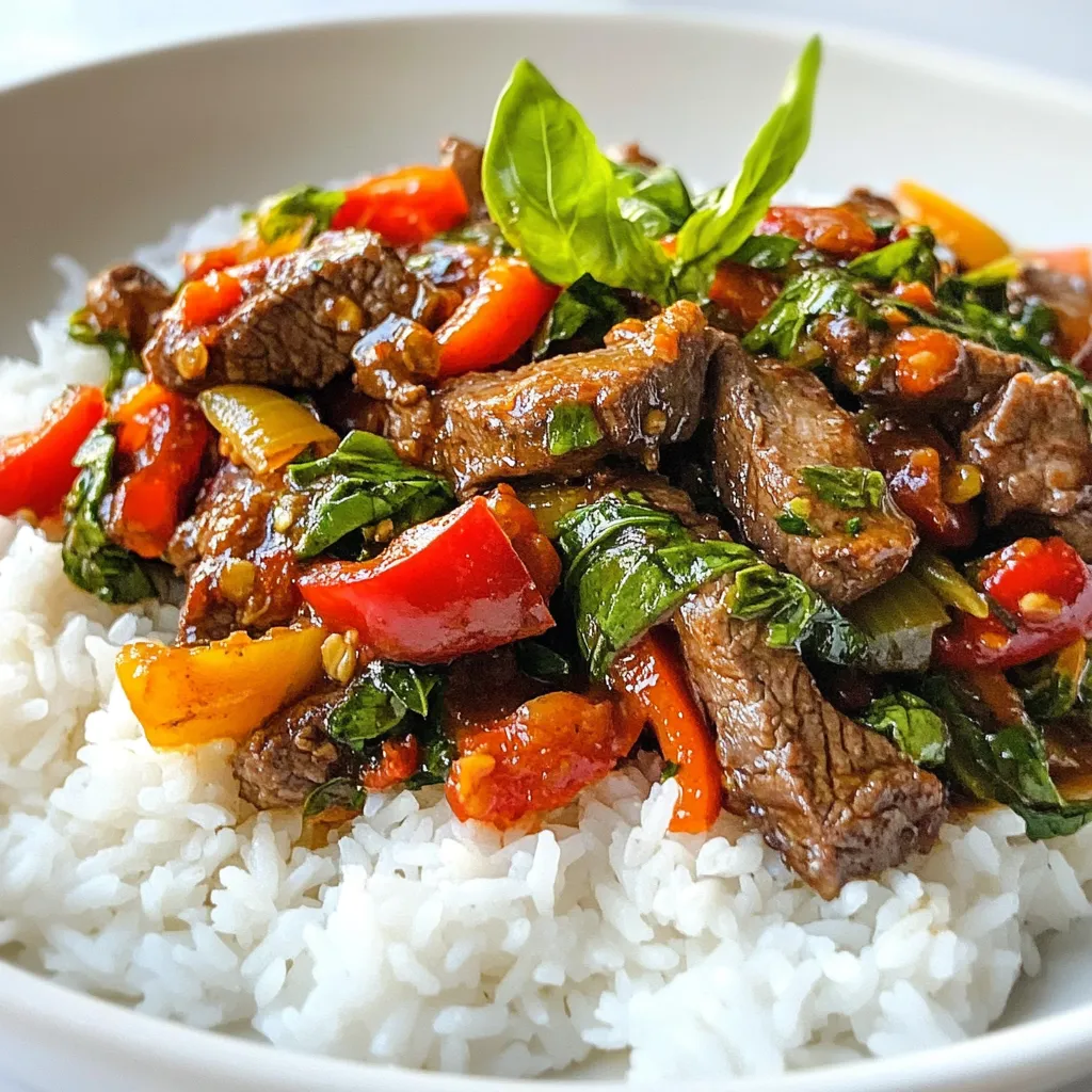Ein schmackhaftes Rindfleischgericht mit frischem Thai-Basilikum und scharfen Chilis.