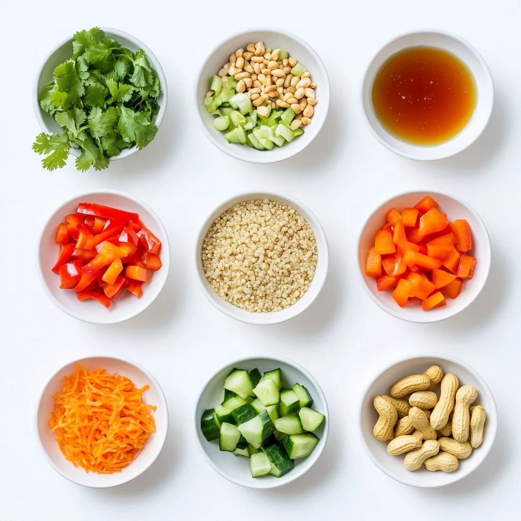 Um diesen leckeren Thai Erdnuss-Quinoa-Salat zuzubereiten, benötigst du folgende Zutaten: