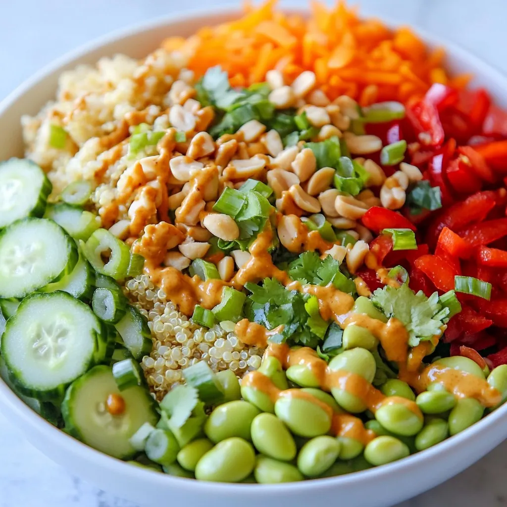 Ein erfrischender und nahrhafter Salat mit Quinoa, buntem Gemüse und einem cremigen Erdnuss-Dressing.